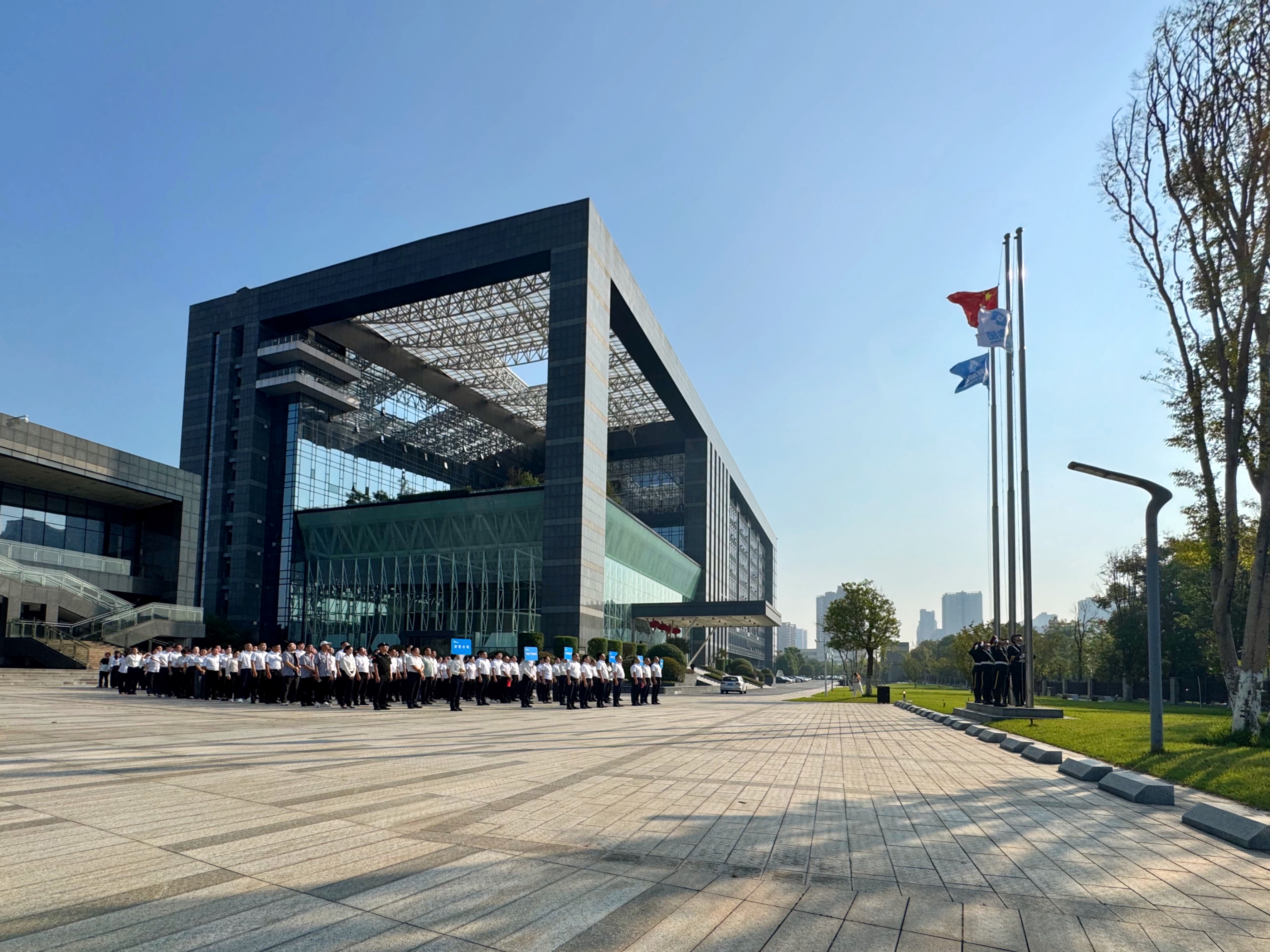 8时58分,仪式正式开始。国旗护卫队队员迈着铿锵有力的步伐护卫五星红旗入场,目光坚定、姿态挺拔。伴随《义勇军进行曲》响起,升旗手振臂扬旗,鲜艳的五星红旗迎风舒展、冉冉升起。全体人员屏息肃立、行注目礼,齐声高唱国歌,向伟大祖国致以最崇高的敬意,衷心祝愿祖国繁荣富强、集团事业蒸蒸日上。