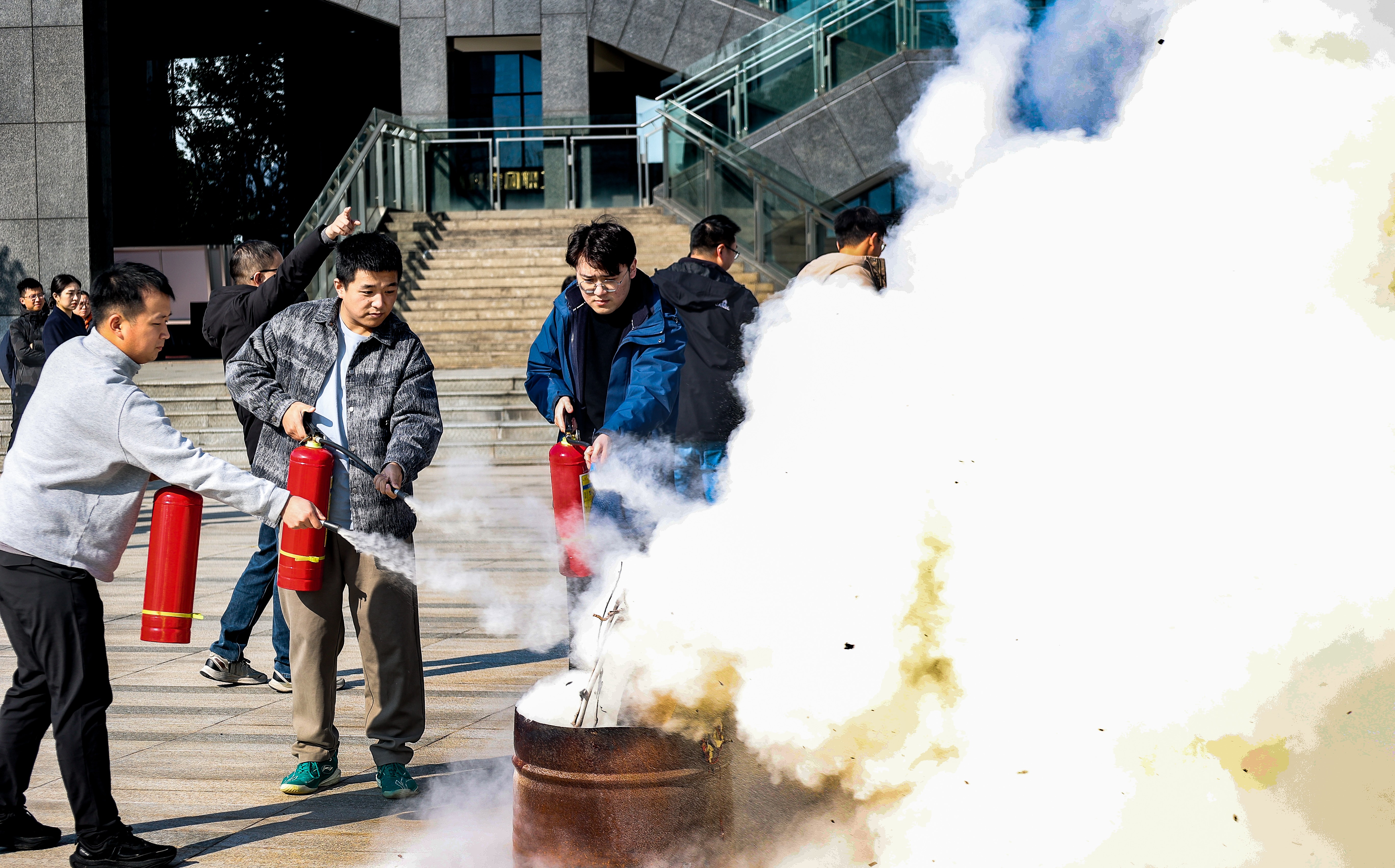 下午14时,演练正式开始。演练模拟英国365集团公司大厦四楼发生火情,消防警报启动后,各楼层员工在青年志愿者的引导下,按预定疏散路线迅速、有序撤离至安全区域。整个过程组织严密、响应及时,有效检验了应急预案的可行性和员工的应急疏散能力。疏散环节结束后,开展了灭火器使用培训与实操演练,消防专业讲师系统讲解了灭火器的分类、工作原理、操作步骤及注意事项,强调使用前检查、站位风向及喷射要领等内容。参训员工随后分批进行了实地灭火操作,进一步掌握初期火灾扑救技能。